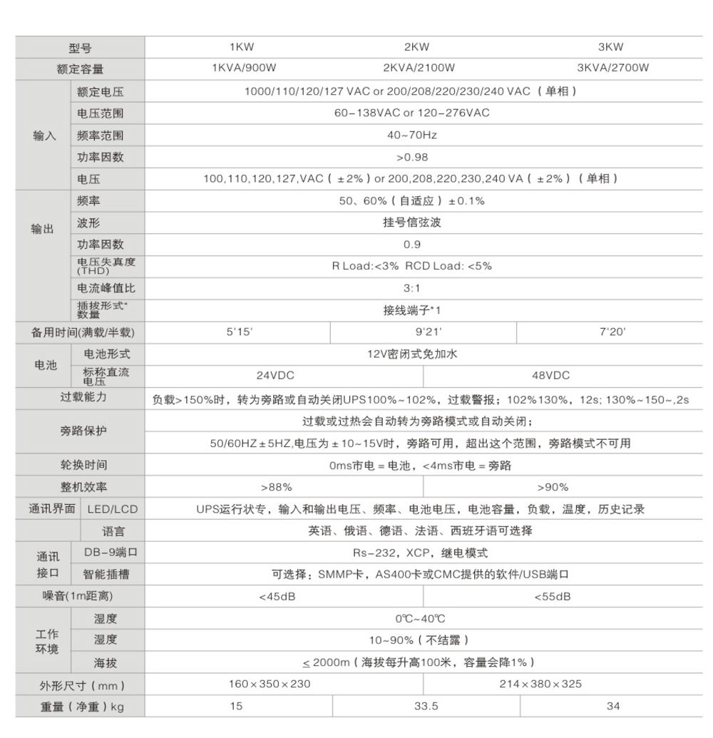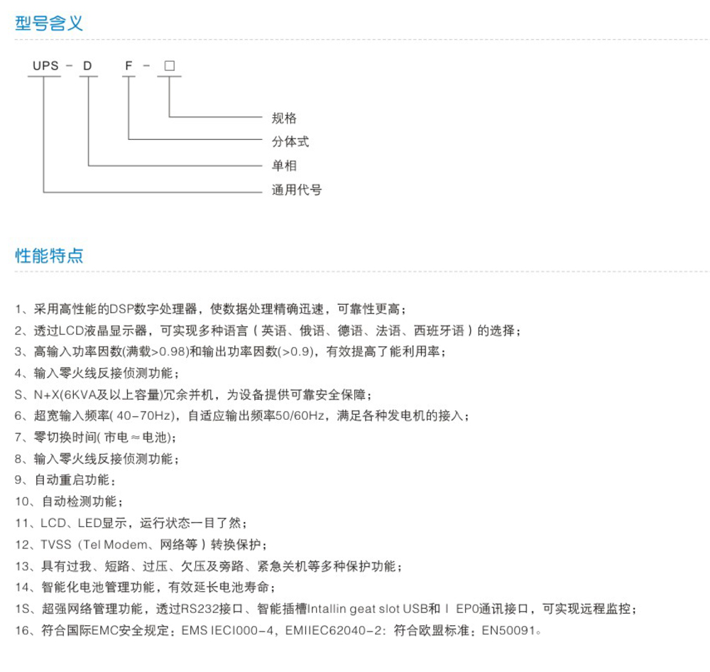 UPS-D/F系列在线式UPS容量包括:1KVA、2KVA、3KVA等3个产品规格,是目前世界上功能最强大,技术最先进,可靠性最高的一款新机型,在线式双变换结构设计,数字化控制技术,超高的输入、输出功率因数,多种语言可选择的LCD显示,根据输入频率自适应输出频率,智能化电池管理,超强的网络管理功能等优点。