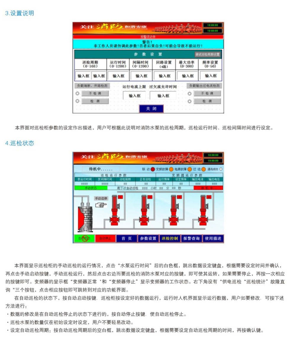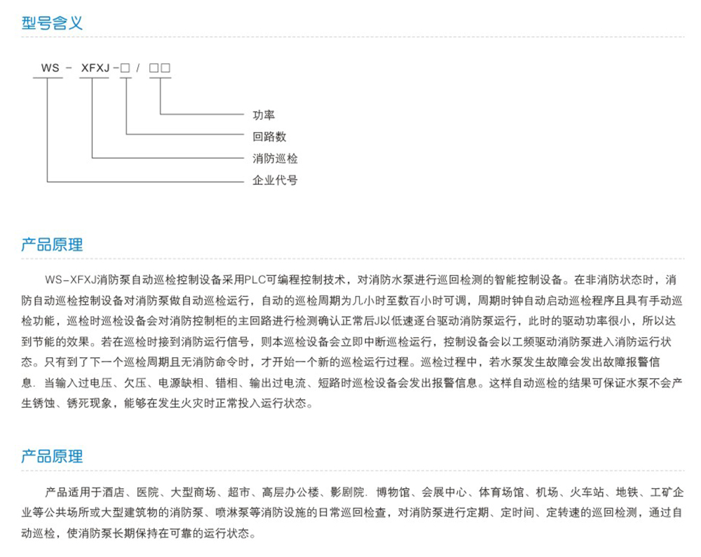 消防给水设备是灭火系统的重要组成部分,其性能和日常维护管理是否完善都会直接关系到我们的生命财产安全。近些年,消防给水设备的技术、性能.自动化程度都得到了较大的发展.但是对于各类消防设备都普遍存在着一个问题,在发生火灾时,消防设备接到启动信号后不能正常的运转.耽误了灭火的时机.造成以上现象的原因,主要是消防泵在平时长期不用,处于闲蓝状态,加上泵房的环境潮湿,随着时间的推移,特别是在夏天,很容易造成受潮、锈蚀、锈死、水泵运行不正常等现象,最后导致发生火灾时消防泵不能运转,无法启动。给国家的财产和人民的生命安全造成很大损失.根据国家标准GB16806-2006《消防联动控制系统》功能要求自主研发设计了wS-XFXJ消防泵自动巡检控制设备。